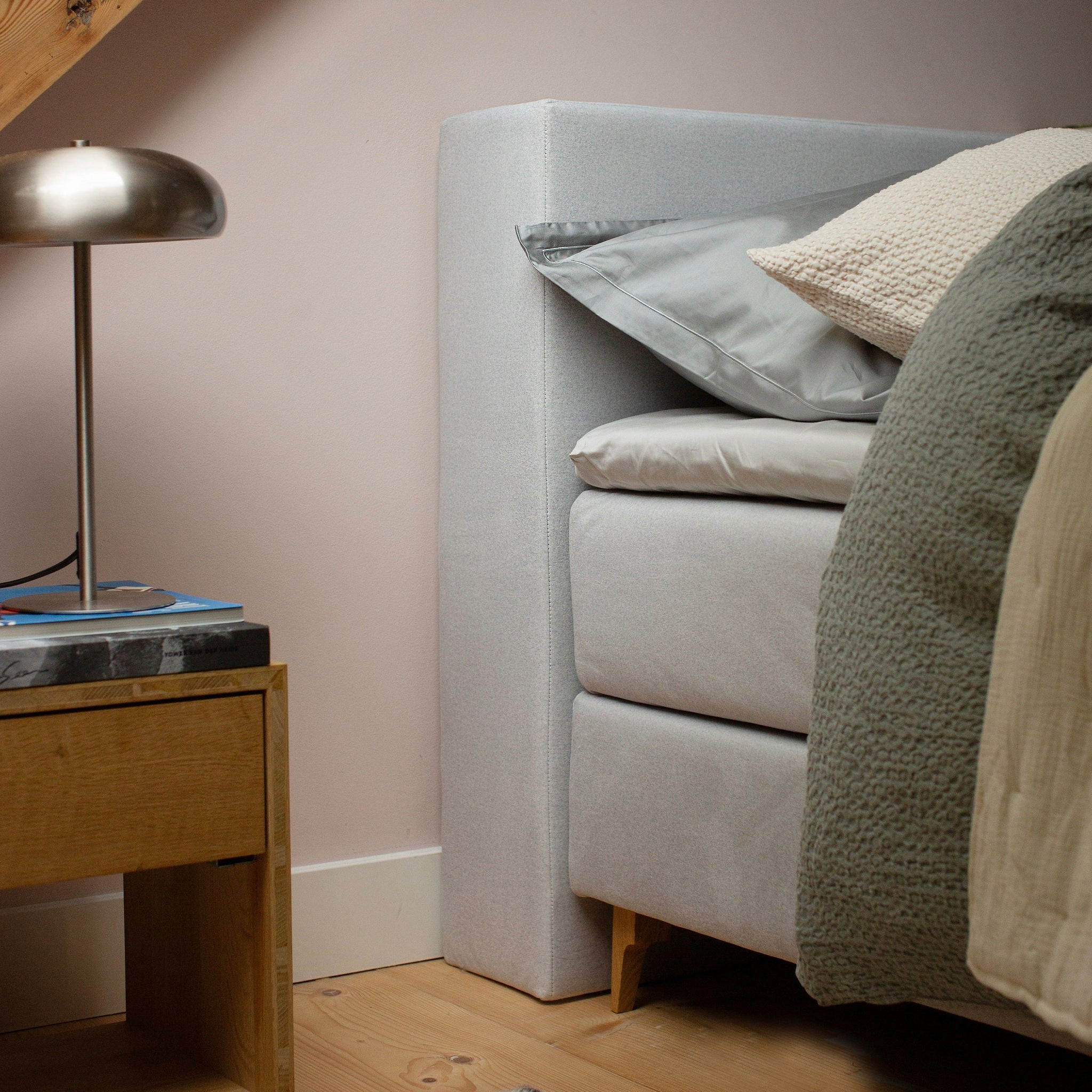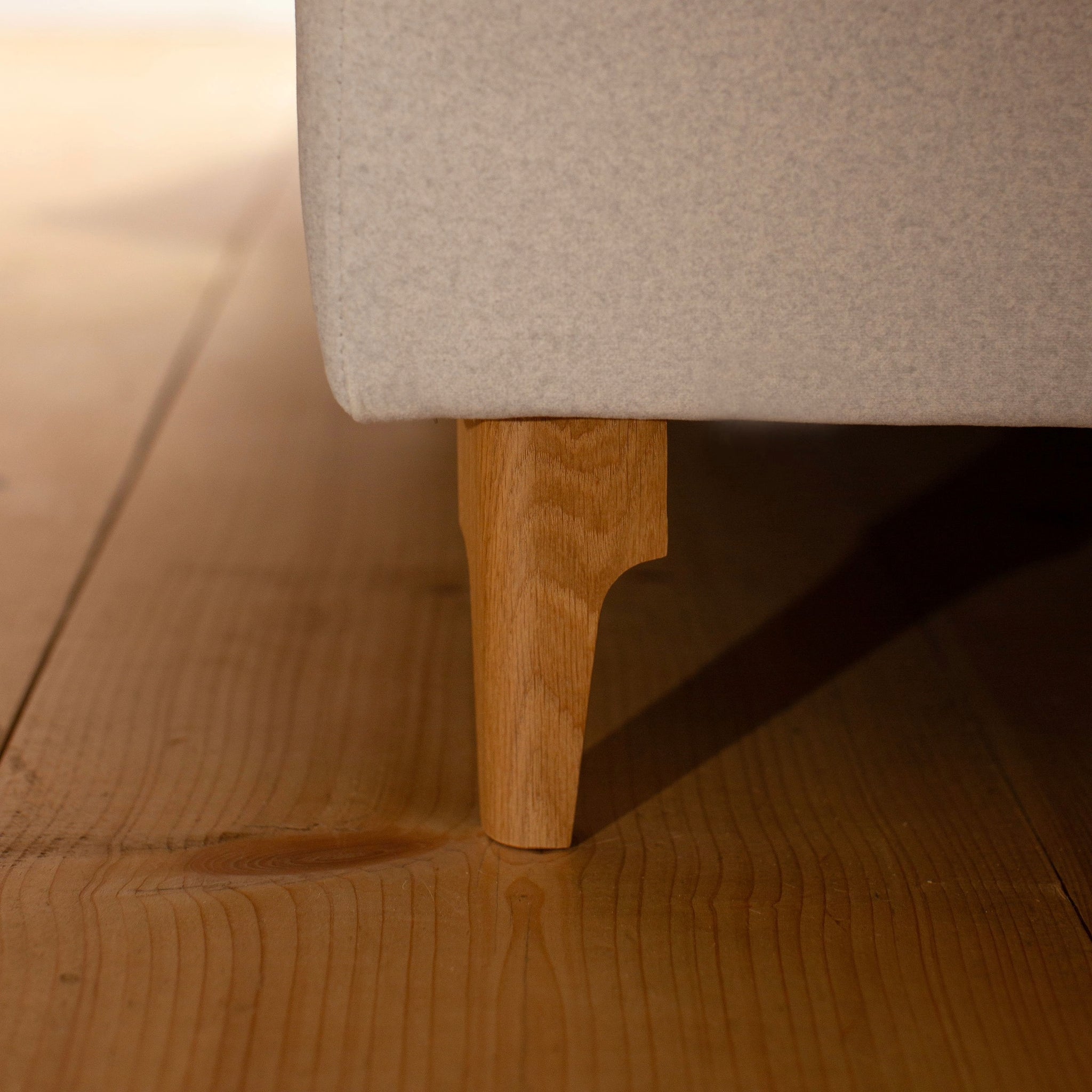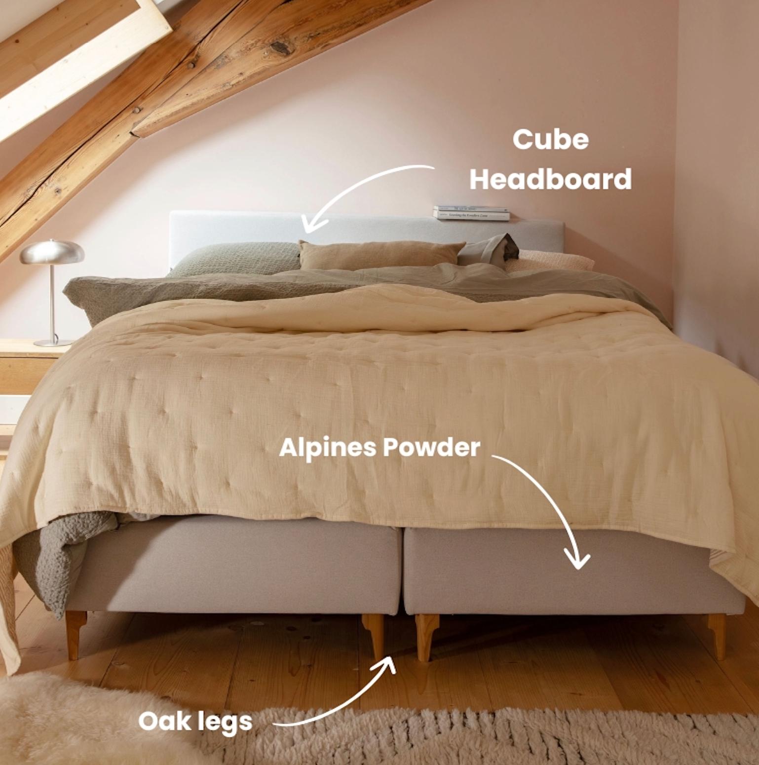 The Alpines are every bit as comfortable as they are stylish. Inspired by the serene beauty of the mountains, our Alpines feature a cozy wool-inspired fabric, complemented by oak legs and our signature slightly lower cube headboard. Our bespoke favourite combination.