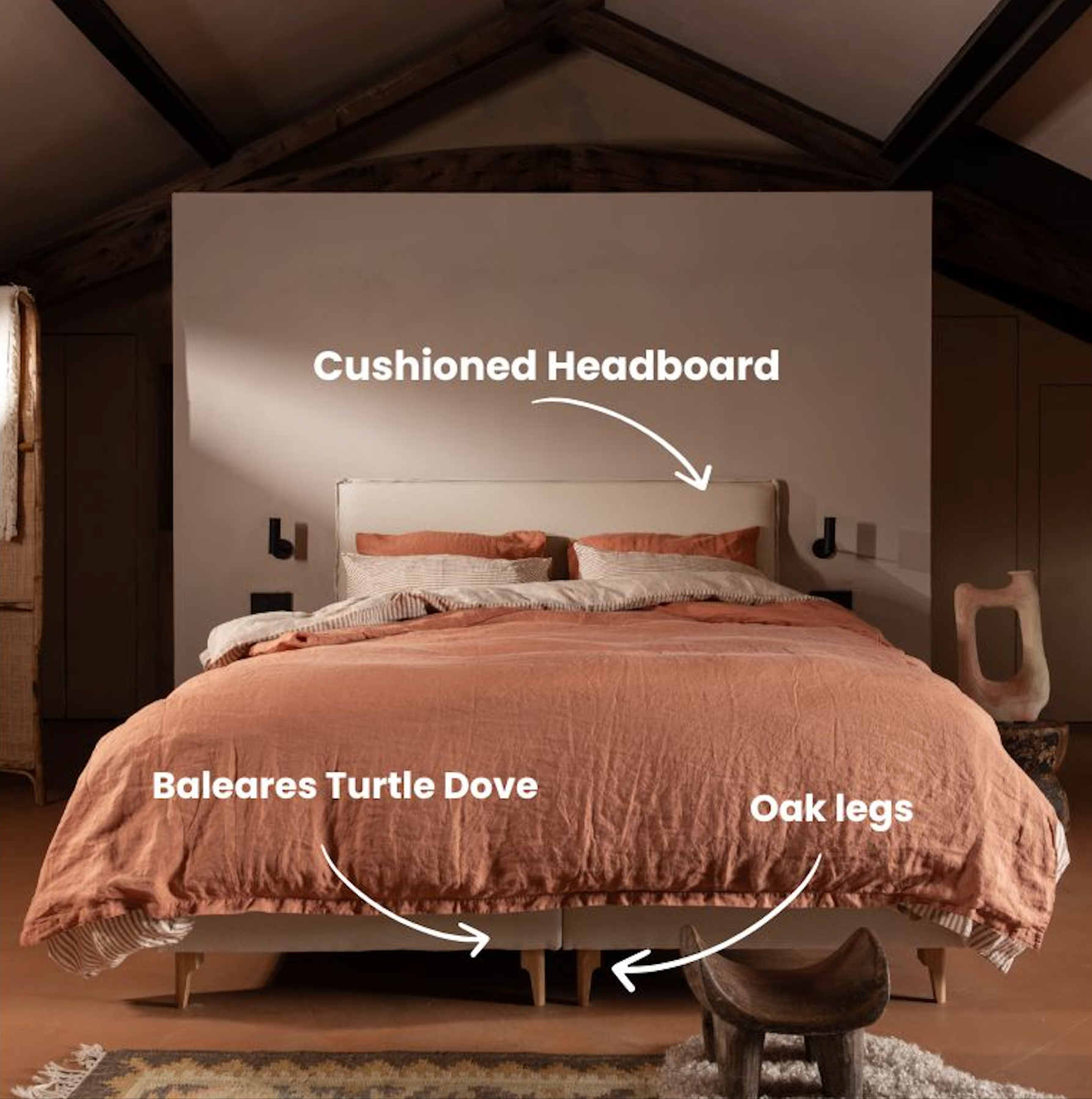 Like the Mediterranean wind, our Baleares Boxspring beds are light and breezy. They come standard with a linnen look fabric in the color of your liking, oak legs and a comfy puffy cushioned headboard. Nothing more relaxing than dozing off in your custom Baleares and dreaming of endless summer nights.